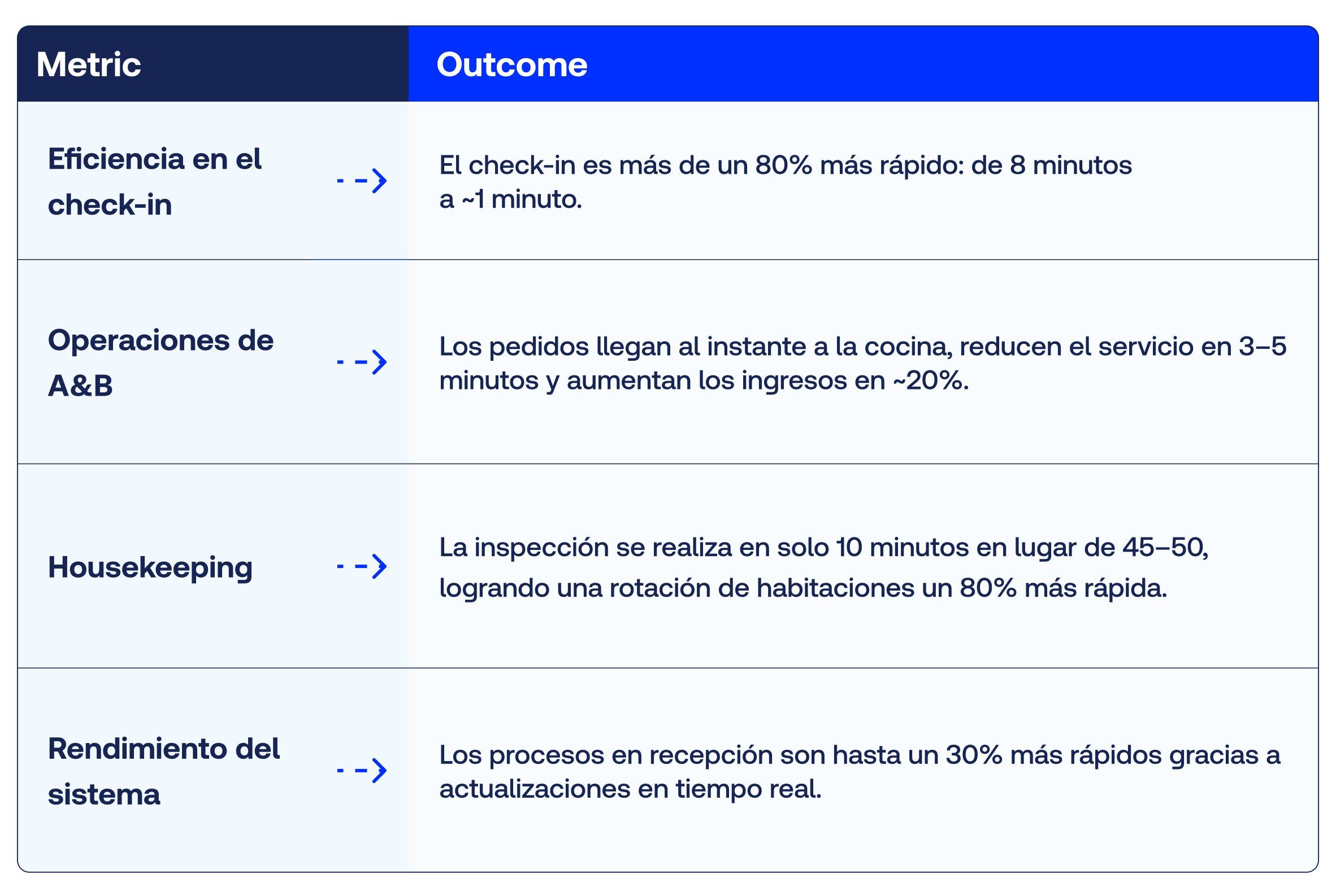 El check-in online hace que la llegada sea más rápida y sencilla para los huéspedes. Las necesidades dietéticas y las peticiones especiales se registran en el momento de hacer el pedido, lo que ayuda al personal a ofrecer un servicio más personalizado. Como resultado, los huéspedes disfrutan de experiencias más rápidas, coherentes y personalizadas, con la tecnología funcionando de forma discreta en segundo plano.
